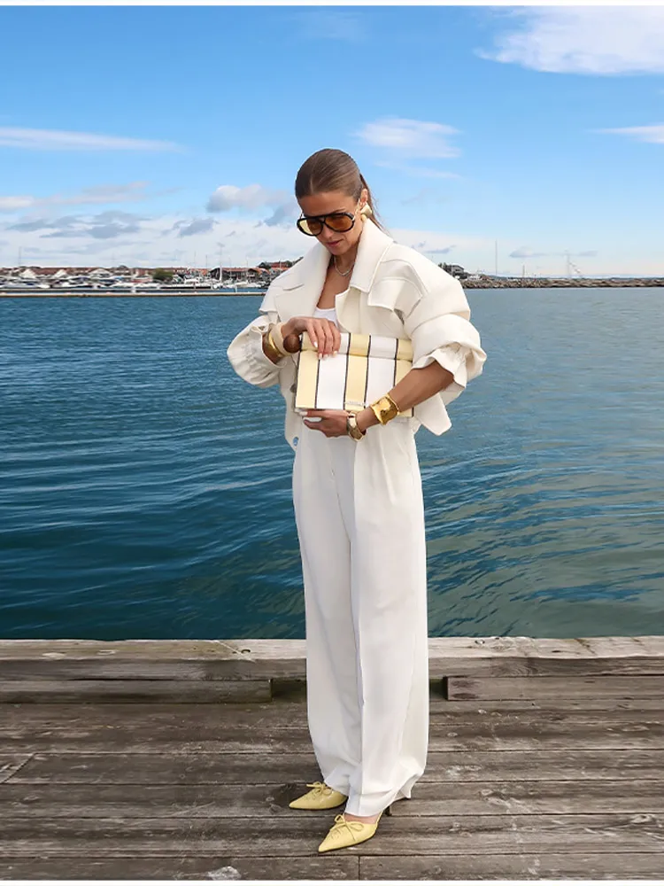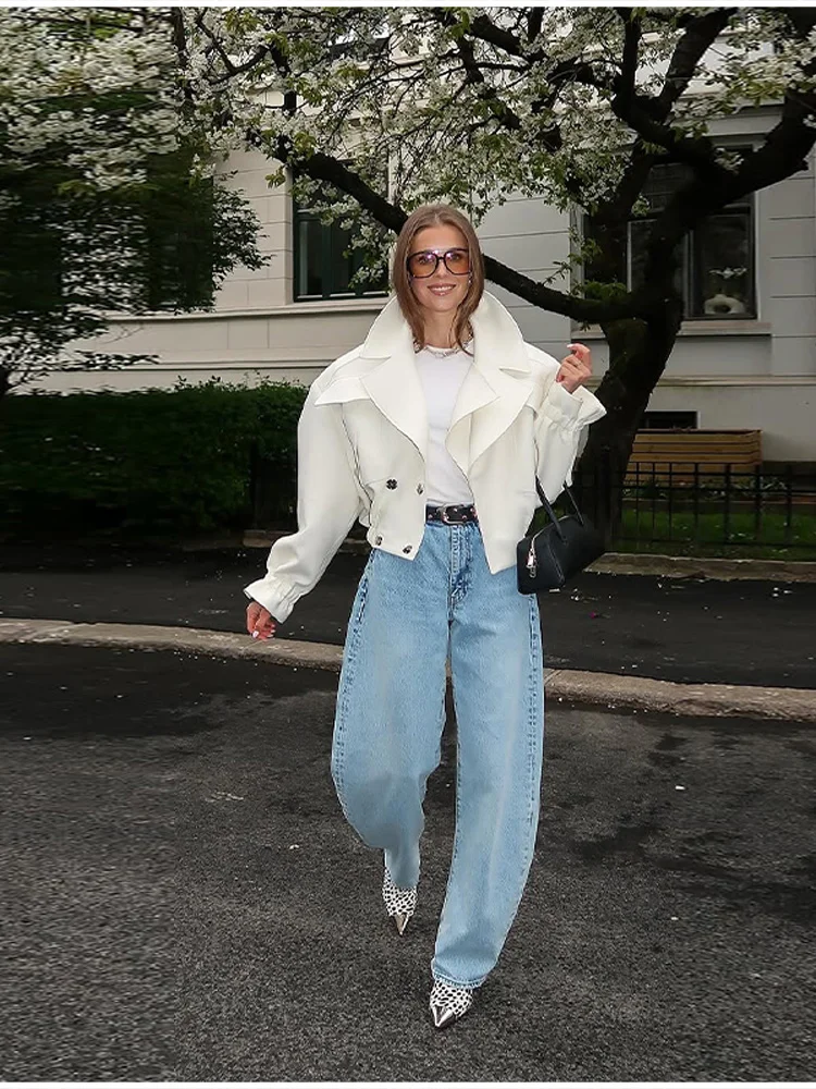 Clean, modern and chic. This cropped jacket delivers instant polish with an oversized lapel and a double-breasted front, creating strong lines that elevate any look—from jeans to tailored pants.