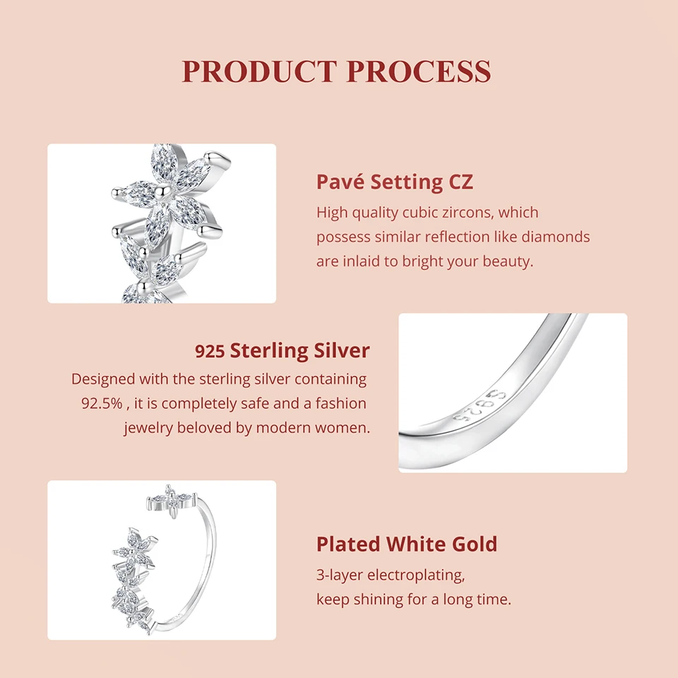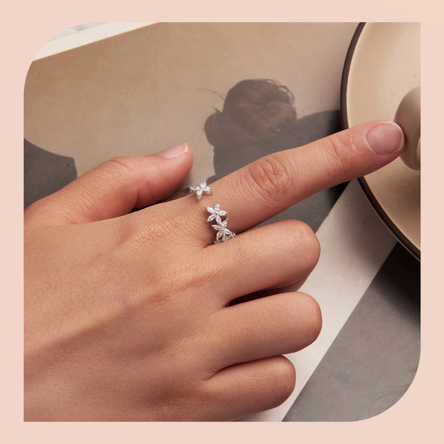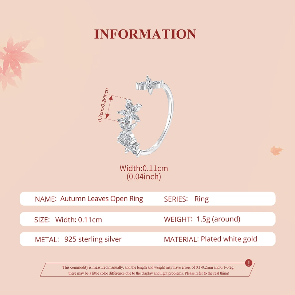 Inspired by falling autumn leaves, this Murps open ring is crafted in genuine 925 sterling silver with a bright white-gold finish. Petite marquise-cut cubic zirconia form mini flowers along a slim, comfortable band. The open silhouette allows a gentle, adjustable fit that stacks beautifully or shines solo.