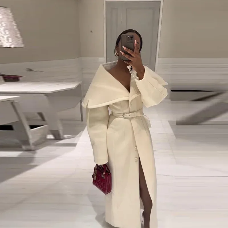 Command the room—quietly. Our Elegant Woolen Belt Long Coat drapes with a fluid, elongated line, then cinches at the waist to sculpt your silhouette. The dramatic shawl collar frames the face (hello, photo-ready), while the single-breasted front keeps everything polished and minimal.