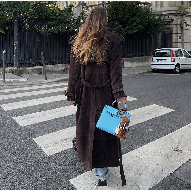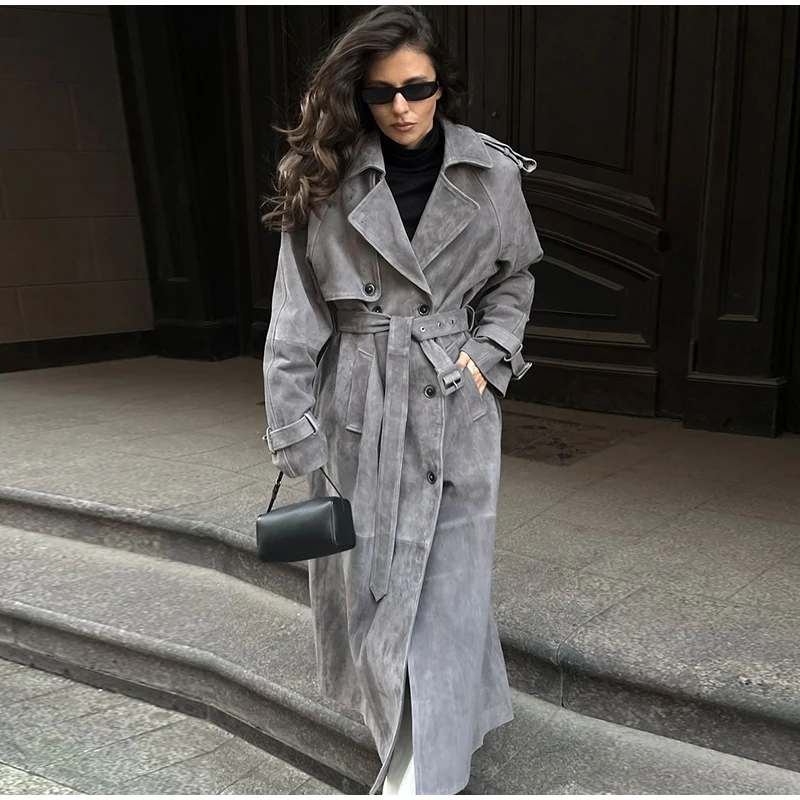 Powerfully polished with a touch of retro drama. This full-length trench wraps you in a soft suede-finish fabric, sharp lapels, and a waist-cinching belt that creates instant shape. Dress it up for nights out or layer it over knits and denim for everyday luxe.